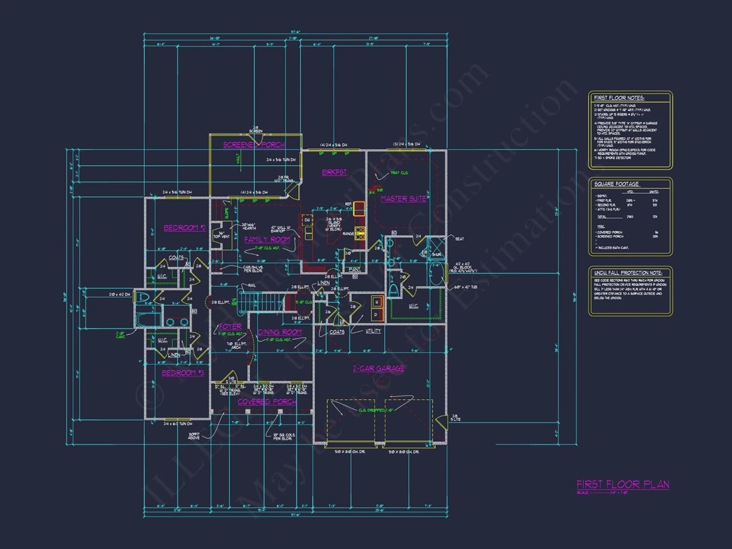 Width: 57′-6″Depth: 56′-0″Htd SF: 2,983Unhtd SF: 1,125Modern Suburban Home Blueprint: 4-Bedroom Floor Plan DesignsThis detailed home design features a 4-bedroom floor plan with modern architecture, 2,983 heated sq. ft., vaulted ceilings, and covered porch spaces—includes CAD blueprints and more.This modern suburban house plan offers a perfect mix of comfort and functionality. Designed for modern living, it delivers timeless charm and smart space planning.Key Features of the Home PlanLiving Areas - Heated & UnheatedHeated area: 2,983 sq. ft. across 1.5 stories.Unheated extras: Screened porch, covered front and rear porches, and a spacious garage.Bedrooms & Bathrooms4 spacious bedrooms including a first-floor Owner Suite with a generous walk-in closet.3 full bathrooms designed for convenience and privacy.Interior HighlightsVaulted ceilings offer a feeling of grandeur and space.Open floor plan joins the kitchen, family room, and dining areas. View open layouts.Kitchen island, walk-in pantry, and breakfast nook support everyday living.Bonus room and recreation space upstairs for hobbies or guests.Garage & Storage DetailsGarage Bays: 2-car garage with optional oversized space.Garage Type: Attached front-entry.Storage: Mudroom, walk-in closets, and upstairs storage options.Outdoor Living FeaturesScreened porch for insect-free relaxation.Covered front and back porches for entertaining or unwinding outdoors.Stone and shake siding enhance the Craftsman-style curb appeal.Architectural Style: Modern Suburban with Craftsman TouchesThis design blends timeless materials and thoughtful details—perfect for families who value character and efficiency in one package. Learn more about the Modern Suburban Style or explore its roots on ArchDaily.Bonus FeaturesFlex room for office or guest room use.Breakfast nook for casual meals with natural light.Split-bedroom layout enhances