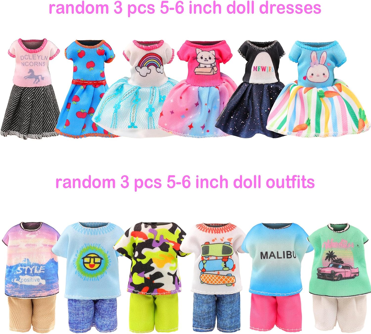 29 pcs doll artiest accessories for 5.3 inch doll 5 fashion dress 5 casual outfit with 4 pairs of shoes 15 entomologist accessories for girl dol; Package Included: 5*girl doll outfits; 5*girl doll dresses; 15 accessories