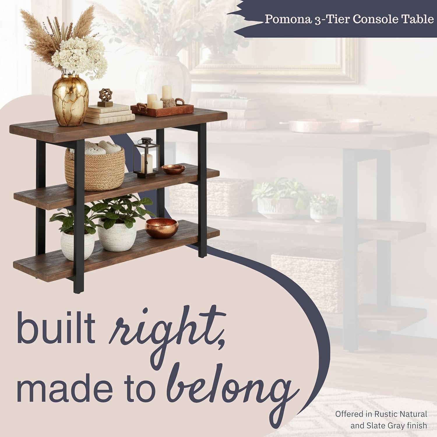 Complement your living room with the rustic industrial style of the Pomona 3-Tier Solid Wood Media Console Table by Alaterre Furniture. Ideal for both large and small living spaces, this console table, crafted from solid pine wood and finished to appear as reclaimed wood, features 2 shelves perfect for displaying pictures, knick-knacks, and other accessories. The reclaimed wood finish enhances the natural beauty of the piece with its captivating variations of cracks and knots for true character. The metal legs of this table pair perfectly with the reclaimed finish for a timeless look, while the sturdy and efficient design offers a neat and organized space, allowing you to showcase your 40" television in a slim profile. Assembly is required to complete the look, and it can be wiped clean with a dry cloth. Transform your living room with the multi-function and timeless beauty of the Alaterre Furniture Pomona 3-Tier Solid Wood Media Console Table.