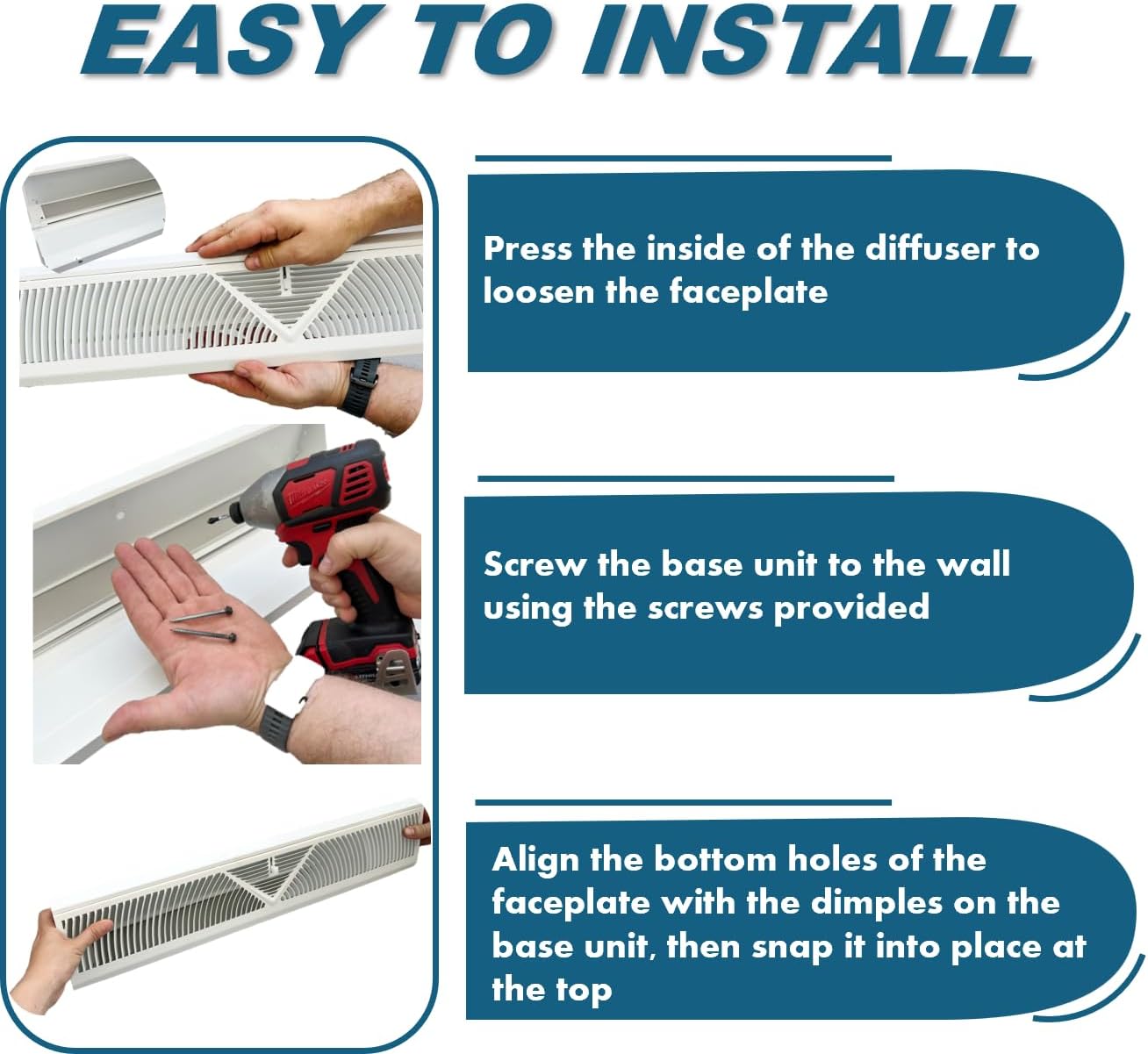 Kumpel Aire Baseboard Register Vent is an adjustable round flow design baseboard register that provides superior airflow in your house. The heavy duty steel construction ensures lasting usage over years to come. An easy adjust air level allows you to control air flow easily. Simply measure the duct opening and ordering the size of duct opening.