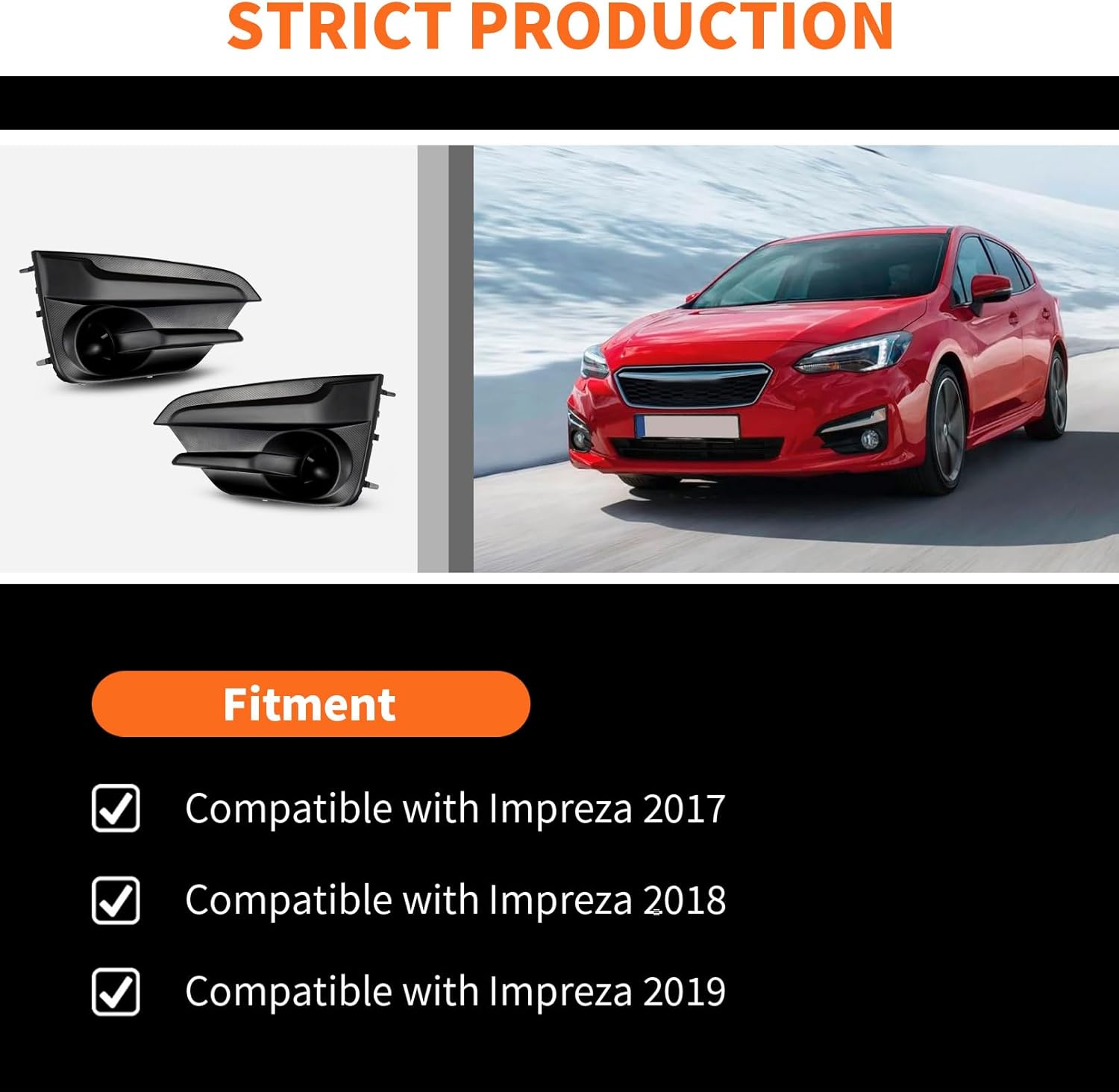 Fitments - Front left right bumper fog light cover bezel compatible with Impreza 2017 Front left right bumper fog light cover bezel compatible with Impreza 2018 Front left right bumper fog light cover bezel compatible with Impreza 2019 Product Detail - Placement on Vehicle: Front; Left; Right Note - Make sure to check the model of the car before purchasing to avoid any incompatibility issues with the product Package Contents - 1 x Driver Side Fog Light Cover, 1 x Passenger Side Fog Light Cover