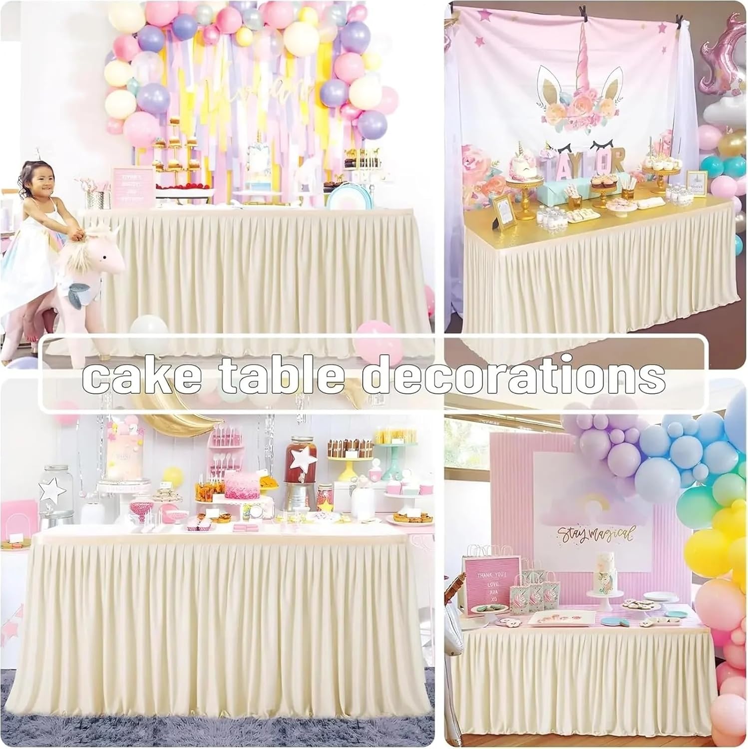 Material: Our party table skirts are crafted from unique materials that add a touch of elegance to any event. The eye-catching shine enhances the overall ambiance, making your table stand out and creating a festive atmosphereFashions Design: The unique table skirt design features beautiful design that provide a playful and lively look. This stylish addition can complement various party themes, adding a fun twist to your table setupExquisite Decoration: Transform your table with our table skirt for party, which offers an exquisite decorative touch. Perfect for enhancing the visual appeal of your dining area, it ensures your table looks stunning for any gathering or celebrationEasy to Use: The Banquet Table Skirt can be quickly assembled in just a few minutes. Its user-friendly design allows you to set it up effortlessly, giving you more time to enjoy the festivities without worrying about complicated installationsVersatile Occasions: These party table skirts are ideal for various occasions, including birthday parties, festive celebrations, and any other gathering that calls for an elegant and vibrant table decoration. Their versatility makes them a must-have for your event planning needs