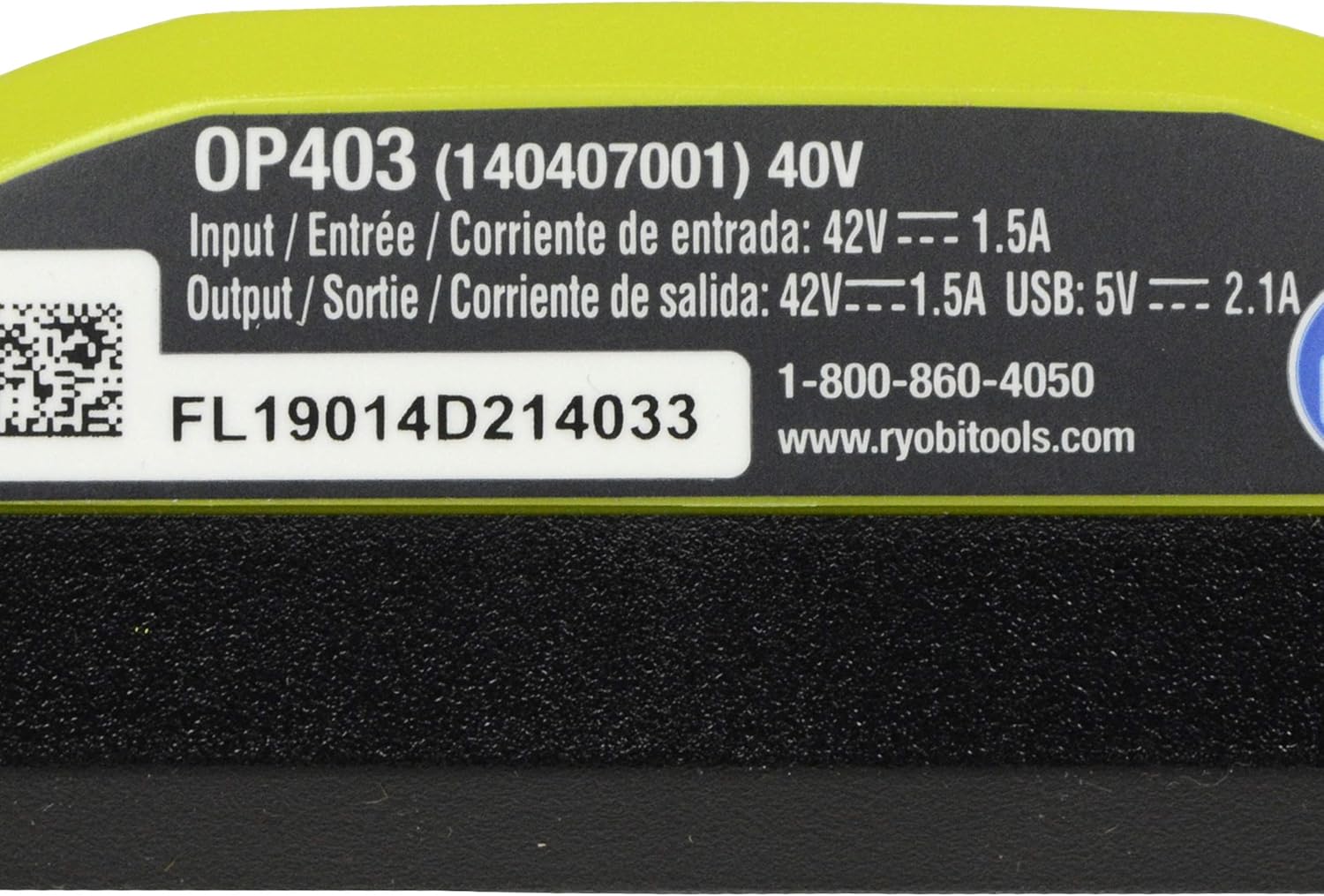This Ryobi OP403 lithium-ion battery charger can rapidly power up a dead battery, so users can spend more time working and less time waiting for a charger. An onboard status indicator monitors batteries as they charge, preventing damage and conserving energy at the same time. LED lights communicate to the user when batteries are charging, fully charged, and defective. Additionally, the OP403 offers USB charging capabilities, so users will never be stranded with a dead phone or MP3 player. Use this OP403 rapid charger to recharge Ryobi 40V li-ion battery models such as OP40401, OP4040A, OP1020A, OP1050A, and OP4026A (sold separately). Note: This charger requires 120V, 60Hz input power and uses the standard two-prong North American plug.
