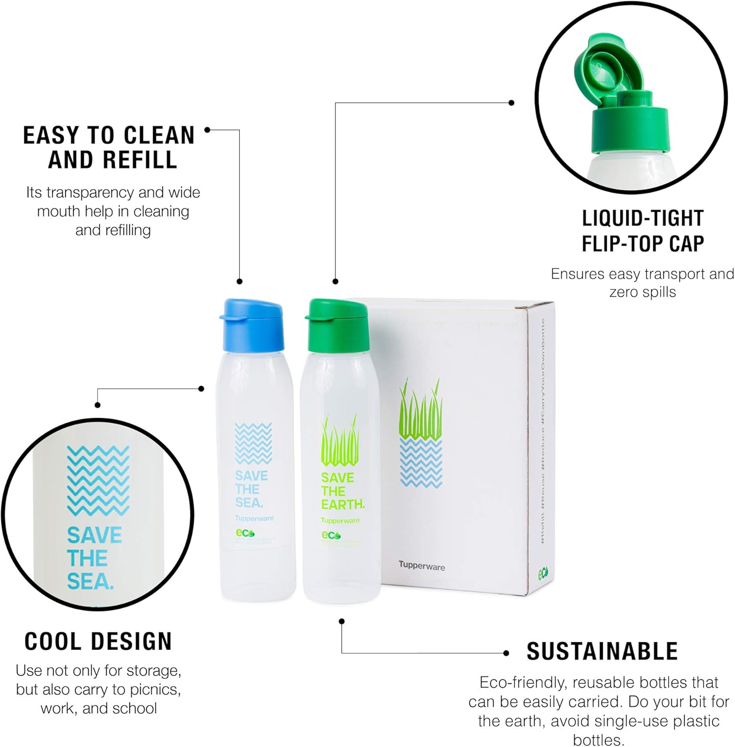 Tupperware Round Fliptop Cool n Chic and Save Earth Save Sea water bottles are designed to pep up your mornings and add a little funk to your step. Equally attractive to the sleepyheads and morning stars, the bottle is spill proof and easy to grip and drink. The attractive print will make you look forward to waking up to that happy sip morning after morning